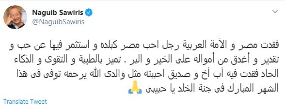 وقال ساويرس في تغريدة له، عبر حسابه الرسمي بموقع التدوين المصغر "تويتر": "فقدت مصر والأمة العربية رجلا أحب مصر كبلده واستثمر فيها عن حب وتقدير وأغدق من أمواله على الخير والبر".