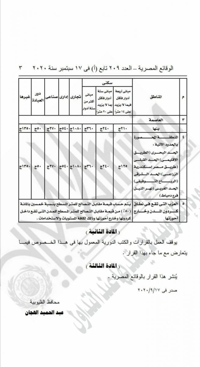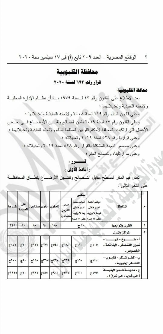 نشرت الجريدة الرسمية قرار محافظ القليوبية، اللواء عبدالحميد الهجان، رقم 693 لسنة 2020، بشأن تعديل جديد في قيم المتر المسطح مقابل التصالح وتقنين الأوضاع بنطاق المحافظة، ليكون التخفيض ما بين 10-33% ويصل إلى أكثر من 55% عند الدفع الفوري وفقًا للنحو التالي: