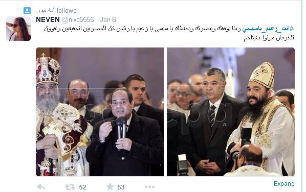 وأضافت "NEVEN": "#انت_زعيم_ياسيسي ربنا يوفقك وينصرك ويحفظك يا سيسى يا زعيم يا رئيس كل المصريين الحقيقيين ونقوول للخرفان موتوا بغيظكم ".
