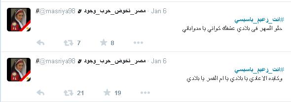 وتابع "Mohamed": "علشان انت راجل معندكش اهل وعشيرة لازم نقولك #انت_زعيم_ياسيسي".