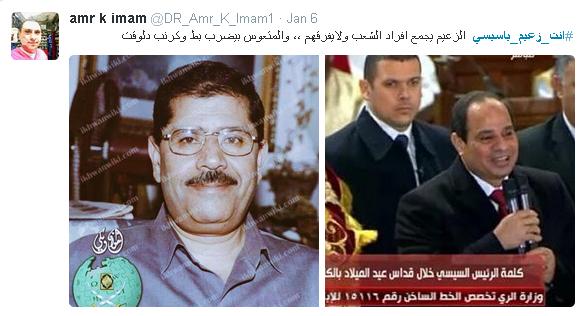 وعقد "amr k imam" مقارنة بين مرسي والسيسي، قائلاً: "#انت_زعيم_ياسيسي الزعيم يجمع افراد الشعب ولايفرقهم ،، والمتعوس بيضرب بط وكرنب دلوقت ".