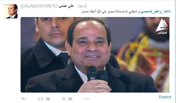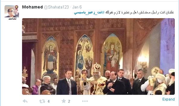 دشن عدد من نشطاء موقع التدوين المصغر "تويتر" هاشتاج جديدًا بعنوان "#انت_زعيم_ياسيسي"، بعد زيارة السيسى للكاتدرائية الكبرى بالعباسية، لتهنئة أقباط مصر بعيد الميلاد المجيد.