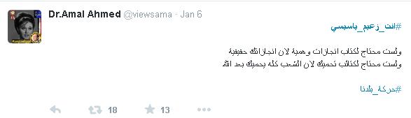 وعلقت "Dr.Amal Ahmed": " ولست محتاج لكتاب انجازات وهمية لان انجازاتك حقيقية ولست محتاج لكتائب تحميك لان الشعب كله يحميك بعد الله ".