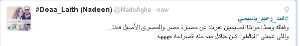 وقالت "(Doaa_Laith (Nadeen": "وقفتك وسط اخواتنا المسيحيين عبرت عن حضارة مصر والمصرى الأصيل فعلا... واللى عجبنى "البالطو" كان هياكل منه حته الصراحة ههههه".