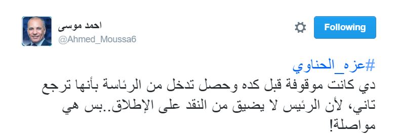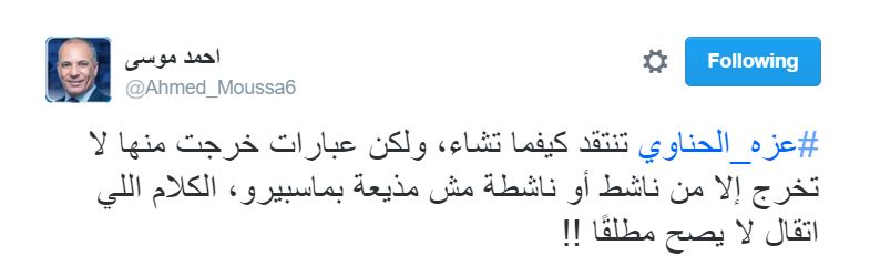 وقال موسى في تغريدة عبر حسابه الشخصي بموقع التدوين المصغر "تويتر": " عزة الحناوي تنتقد كيفما تشاء، ولكن العبارات التي خرجت منها لا تخرج إلا من ناشط أو ناشطة مش مذيعة بماسبيرو، الكلام اللي اتقال لا يصح مطلقًا ".